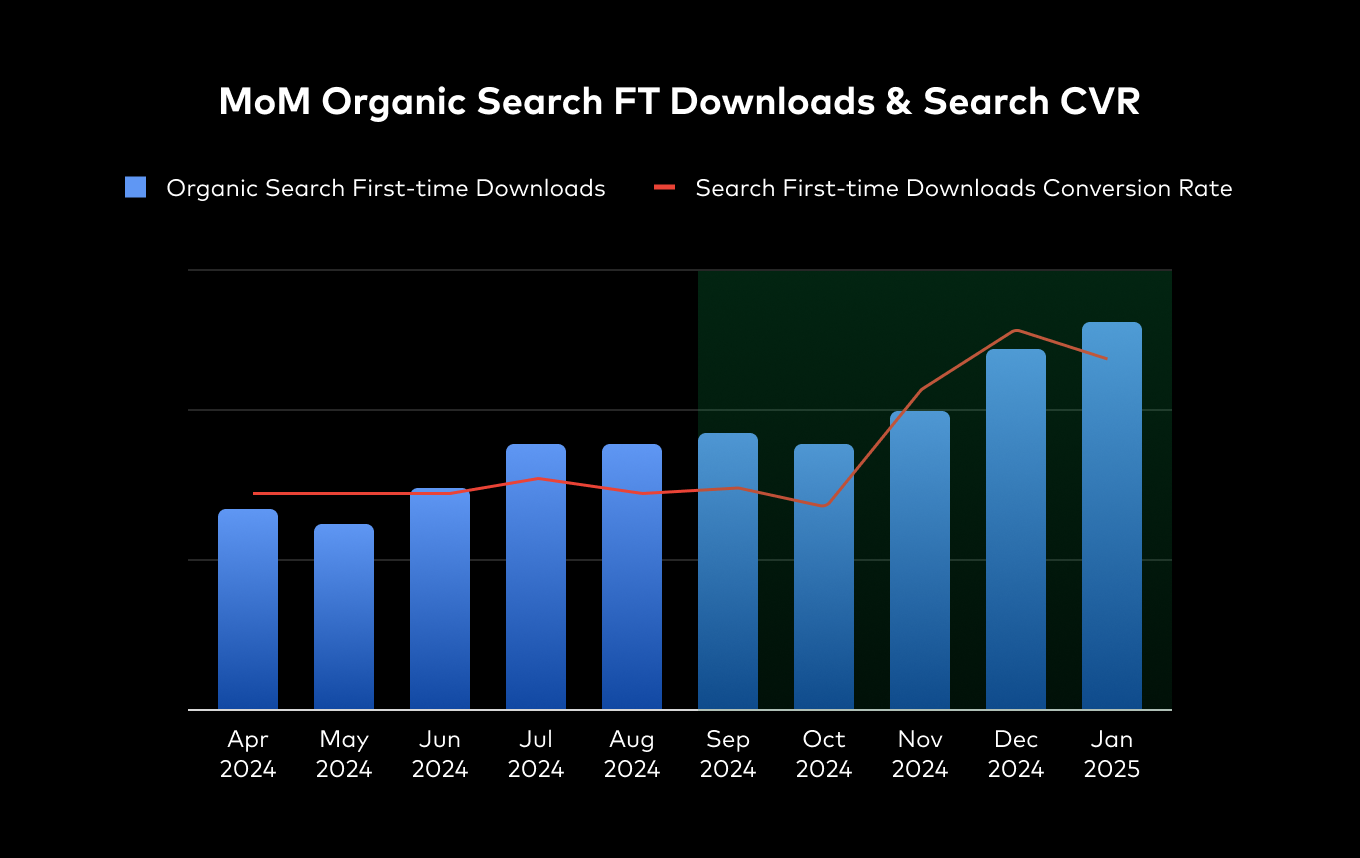 On iOS, continuous ASO enhancements delivered substantial gains in organic visibility and user engagement. The app successfully reversed previous declines in organic search downloads, demonstrating consistent month-over-month growth and notable improvements in search conversion rates.